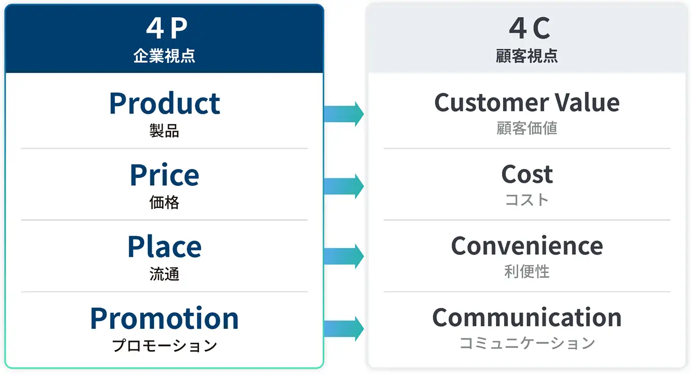 | ・Product(製品) ・Price(価格) ・Place(流通) ・Promotion(プロモーション) の4つの要素から、企業がどのように製品を売るかを検討する分析手法 | ・Customer Value(顧客価値) ・Cost(コスト) ・Convenience(利便性) ・Communication(コミュニケーション) の4つの要素から、顧客がどのように製品を買うかを検討する分析手法 |