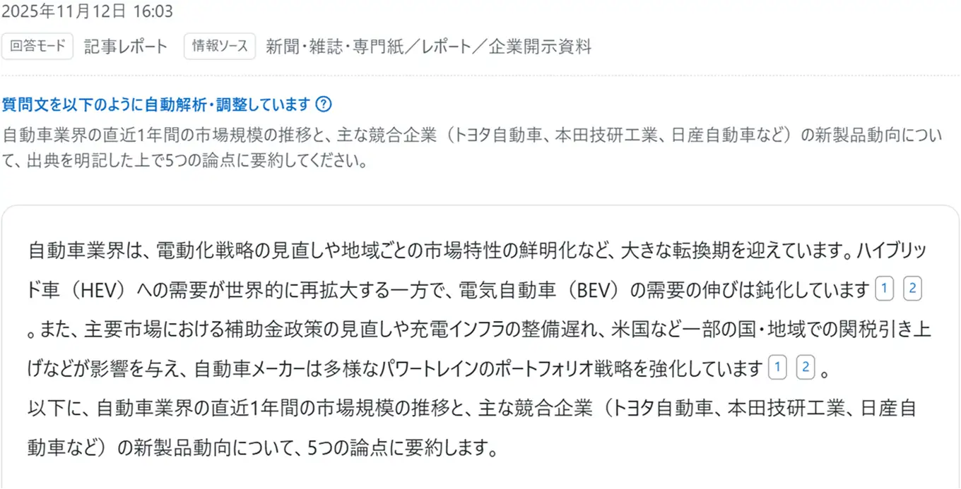 NIKKEI KAIは、信頼性の高い日経電子版や有料データベースを情報源にしているため、一次情報に基づいた検索・要約が可能です。こうした仕組みにより、実務での活用にも安心して利用できる環境を提供しています。