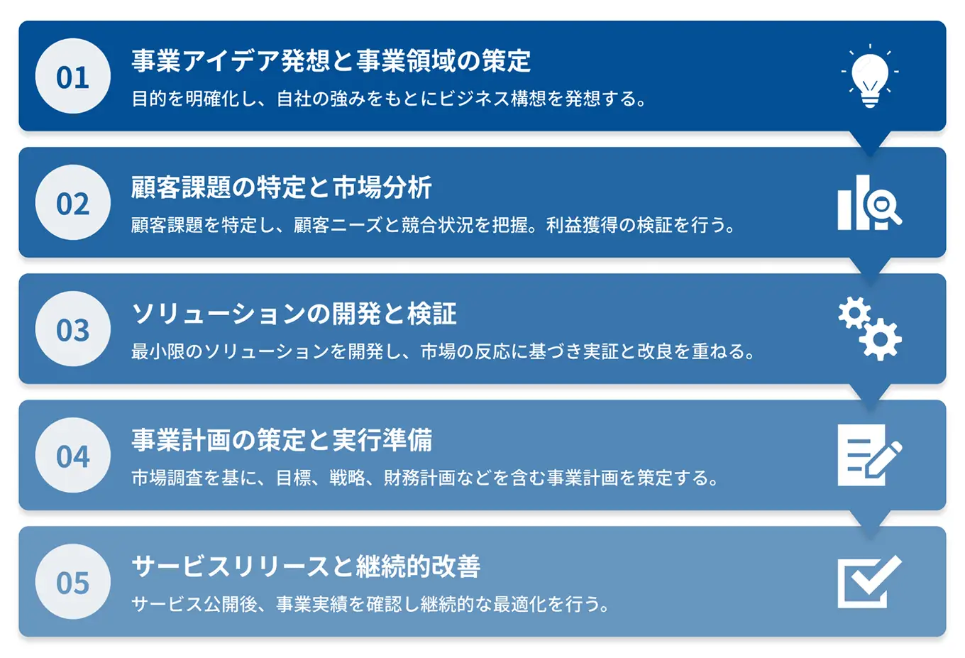 新規事業を成功に導くためには、体系的なプロセスに沿って進めることが重要です。ここでは、新規事業立ち上げの5つのプロセスを詳しく解説します。