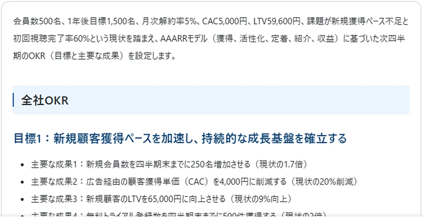 出力された回答結果を参照しつつ、次はOKRを設定していきます。