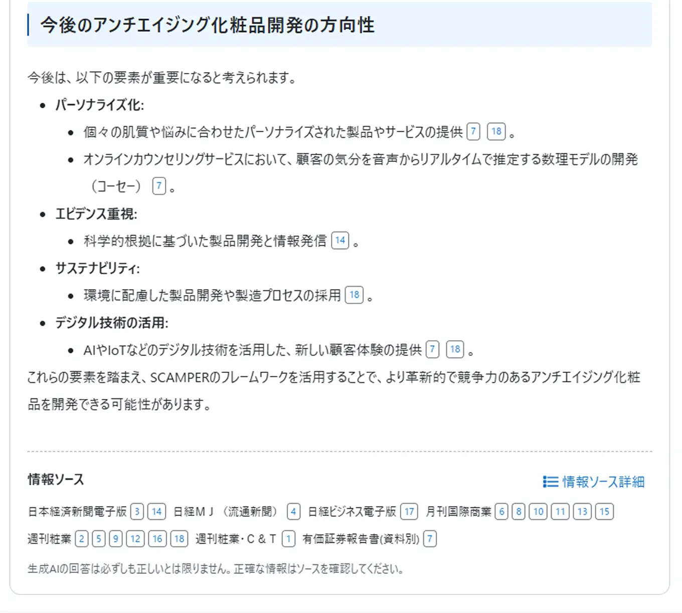 NIKKEI KAIでは、単純に出力結果だけではなく、下図のように今後の製品開発の方向性についてもリサーチ結果を元に回答してくれるため、事業アイデアの発想のきっかけを提供してくれます。
