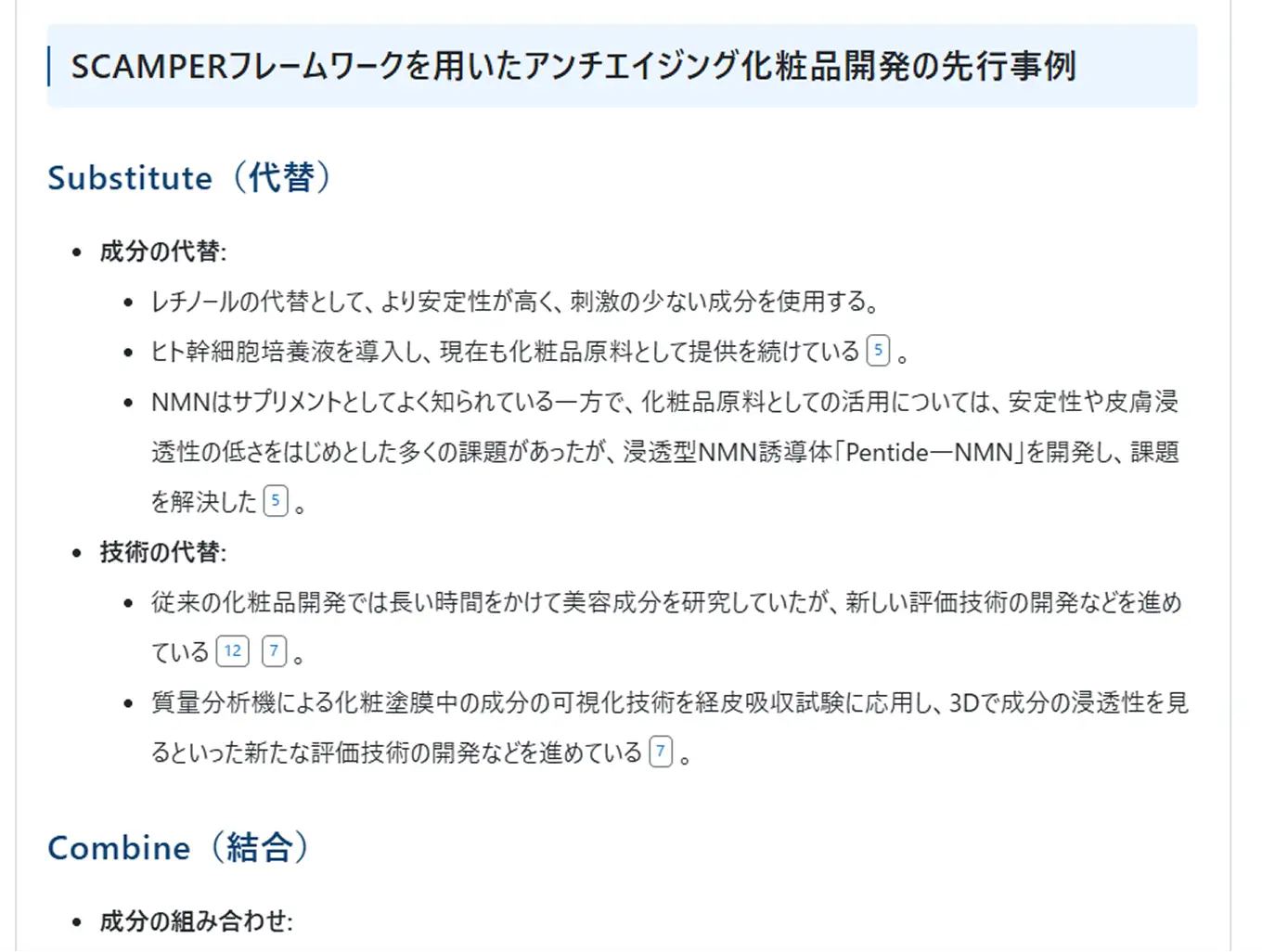 アンチエイジング化粧品の新商品を検討したいので、SCAMPERのフレームワークを用いて、先行事例を教えてください。