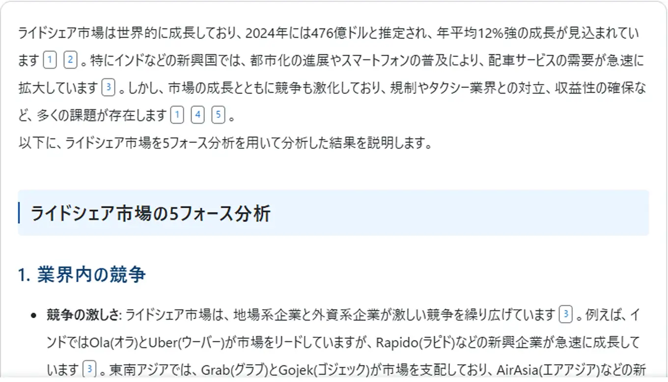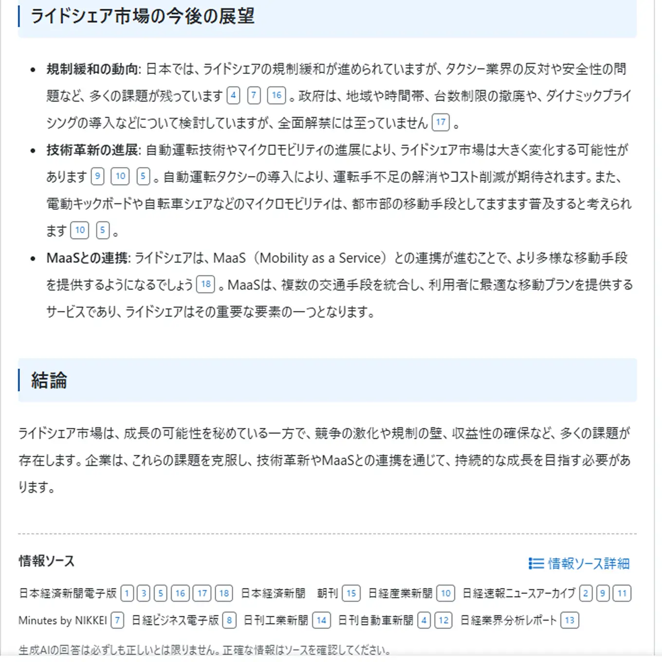 ここでは例として、ライドシェア市場における動向調査について、5フォース分析をNIKKEI KAIで実行してみます。