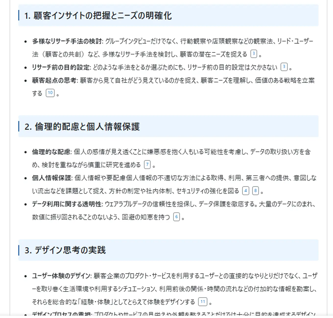 実行後、デザインシンキングの観点での検討事項について回答が出力されます。