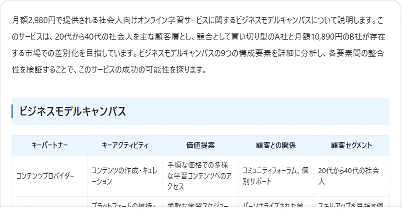 「オンライン学習サービス(月額2,980円、社会人向け)」のビジネスモデルキャンパスを9ブロックで作成してください。顧客は20-40代、競合はA社(買い切り)とB社(月額10,890円)。差別化ポイントを明確にし、ブロック間の整合性を検証。表形式で出力してください。