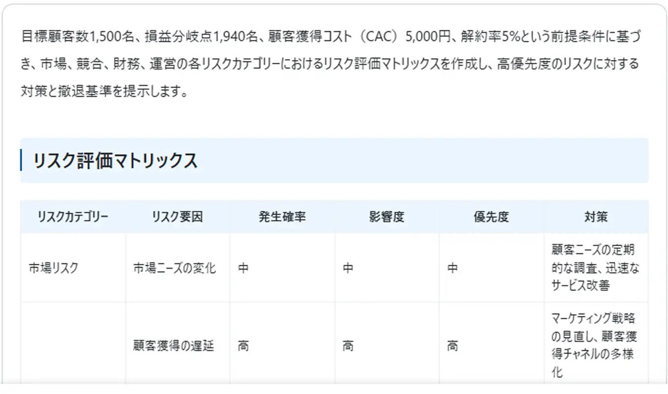 リスクマトリックス作成。目標1,500名、損益分岐点1,940名、CAC 5,000円、解約率5%。市場・競合・財務・運営リスクを発生確率×影響度で評価。高優先リスクの対策と撤退基準(6ヶ月300名未満等)を提示してください。