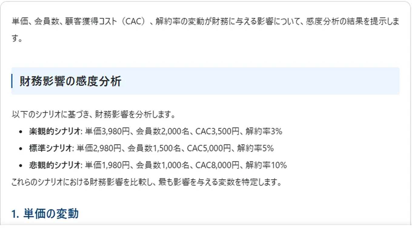 感度分析実施。楽観(単価3,980円、会員2,000名、CAC 3,500円、解約率3%)/標準(2,980円、1,500名、5,000円、5%)/悲観(1,980円、1,000名、8,000円、10%)で財務影響評価。最重要変数と早期管戒指標を特定してください。
