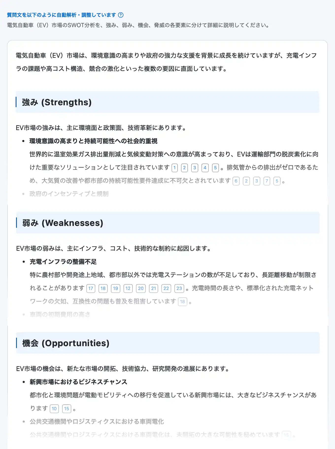 今回は、電気自動車についてSWOT分析したレポート作成を例に取り上げつつ、まずは作成したい内容を赤枠の部分に記載し、生成を実行します。