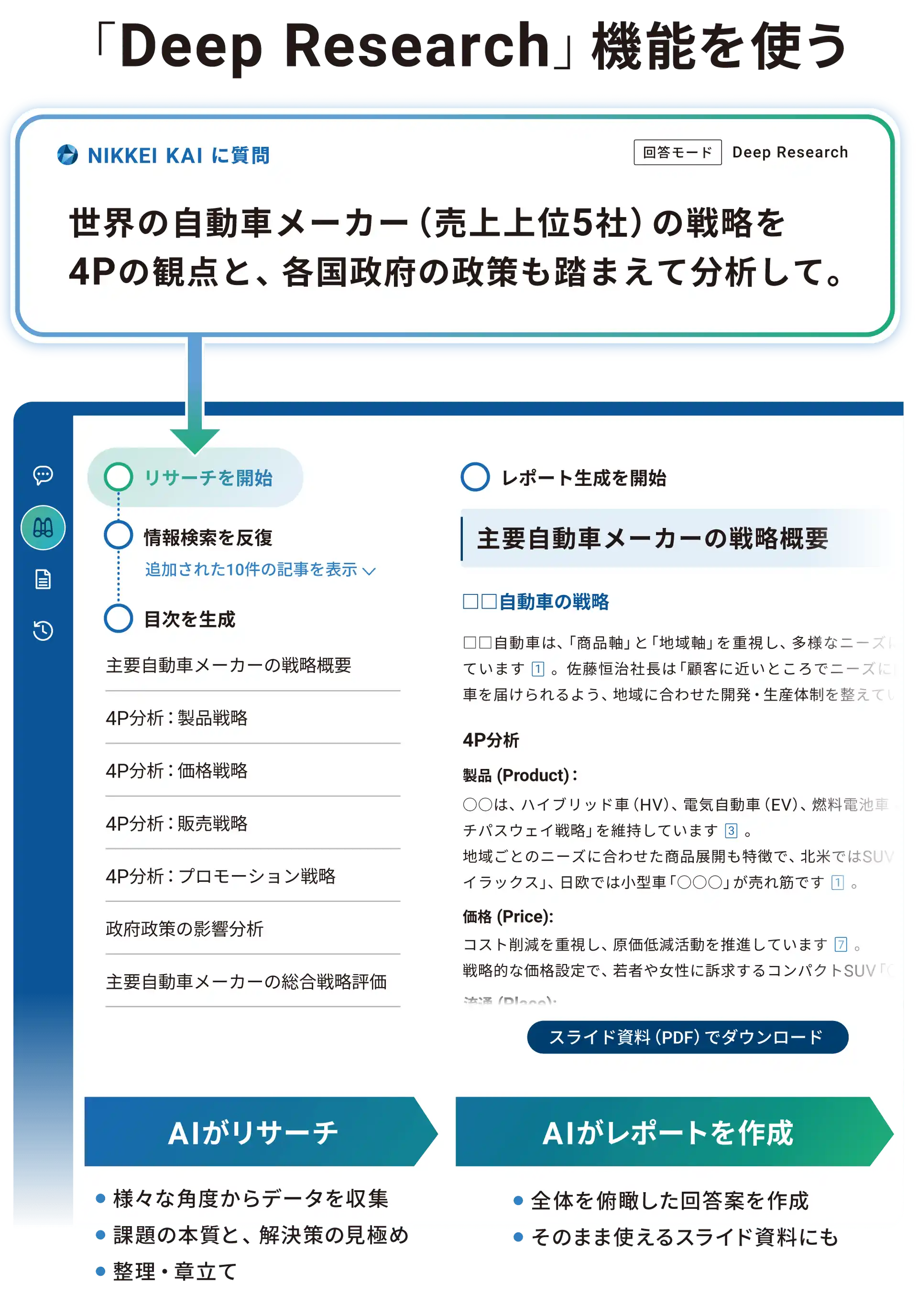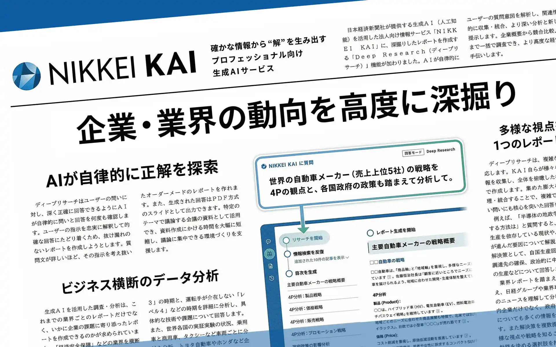 本記事は、日本経済新聞での法人向け生成AI「NIKKEI KAI」特集(2025年11月17日)の再編集版です。今回、KAIに深掘りレポートを作成できる「Deep Research(ディープリサーチ)」機能が加わりました。企業概要から競合比較、業界俯瞰までを一括で調査でき、より高度な経営判断をお手伝いします。