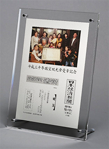 - お手持ちの記念写真と記事を組み合わせた「思い出額装」はいかがでしょうか。褒章・叙勲の受章記念や、昇進・昇格の記念、ご出産、入学式、成人式、結婚式など人生の幅広いシーンや大切な思い出を、記事とともに記録します。