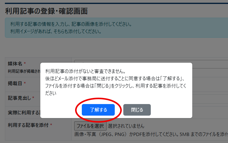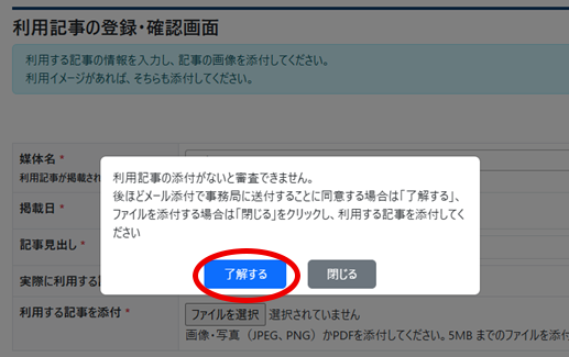 記事画像を後で送る場合は、見積依頼の途中で表示されるポップアップ画面の「了解する」を選んでください。